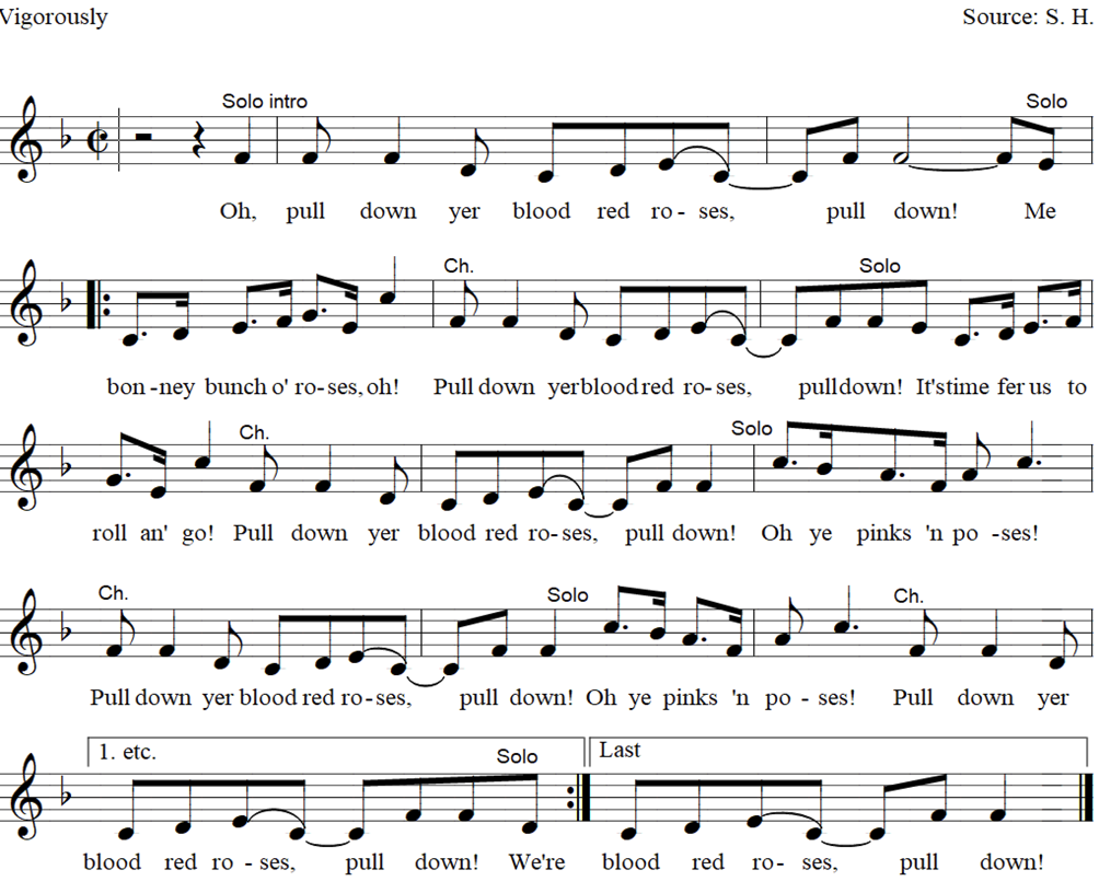 Me bonny bunch o’ roses, oh! Pull down yer blood red roses, pull down! It’s time fer us to roll an’ go! Pull down yer blood red roses, pull down! Oh, ye pinks an’ posees! Pull down yer blood red roses, pull down! Oh, ye pinks an’ posees! Pull down yer blood red roses, pull down!