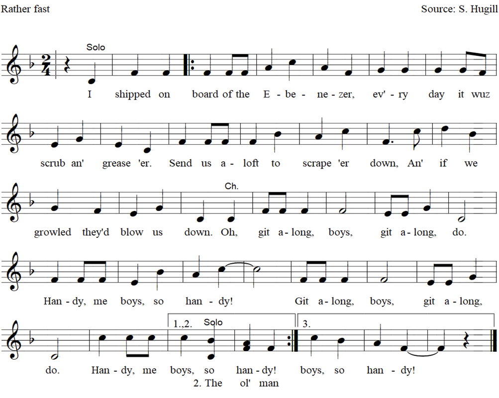 I shipped on board of the ‘Ebenezer’. Ev’ry day it was scrub an’ grease ‘er. Send us aloft to scrape ‘er down. An’ if we growled they’d blow us down. Hey, git a-long, boys, git a-long do, Handy me boys, so handy! Git a-long, boys, git a-long do, Handy me boys, so handy!