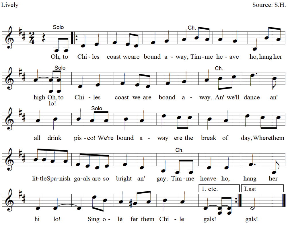 Oh, to Chile’s coast we are bound away’ Timme heave - ho, hang ‘er hilo! Oh, to Chile’s coast we are bound away, An’ we’ll dance an’ all drink pisco! We are bound away at the break of day, Where them little Spanish gals are so bright an’ gay. Timme heave - ho, hang ‘er hilo! Sing olé for them Chile gals!