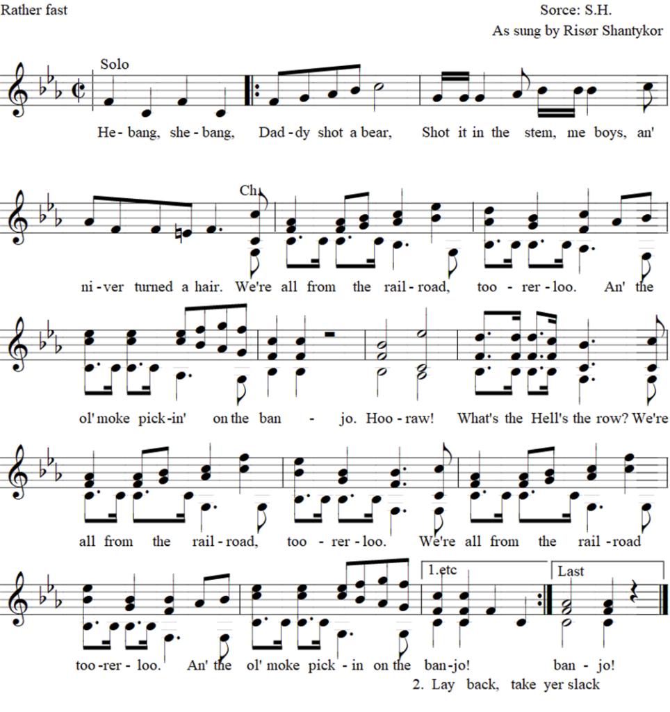He-bang, she-bang, daddy shot a bear, Shot ‘im in the stem, me boys, an’ niver turned a hair. We’re all from the railroad - too-rer-loo, An’ the ol’ moke pickin’ on the banjo. Hoo - raw! What the Hell’s the row? We’re all from the railroad - too-rer-loo, We’re all from the railroad - too-rer-loo, An’ the ol’ moke pickin’ on the banjo!