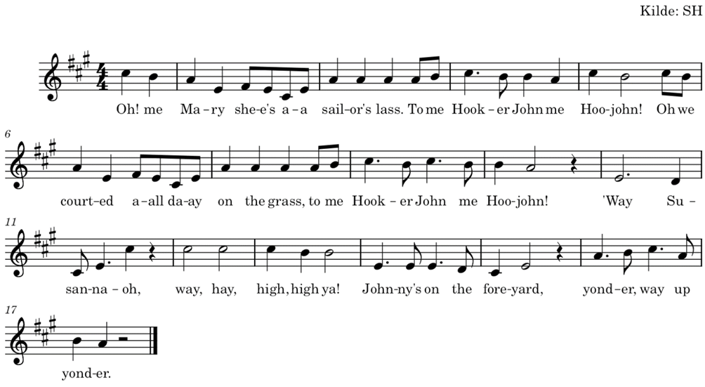 Oh, me Mary she's a sailors lass To me Hooker John, me Hoojohn! Oh, we courted all day on the grass To me Hooker John, me Hoojohn! 'Way Susanna, oh, way, hey, high, high ya! Johnny's on the foreyard, Yonder, way up yonder