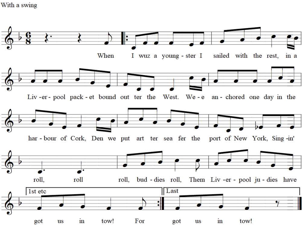 When I wuz a youngster I sailed with de rest, On a Liverpool packet bound out ter the West. We anchored one day in de harbour of Cork, Den we put art ter sea fer de port of New York Singin’ roll, roll bullies roll, Them Liverpool Judies have got us in tow.