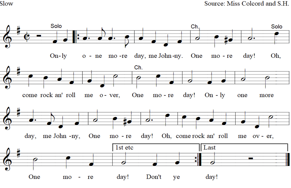 Only one more day, me Johnny, One more day! Oh, come rock ‘n’ roll me over, One more day! Only one more day, me Johnny, One more day! Oh come rock ‘n’ roll me over, One more day!
