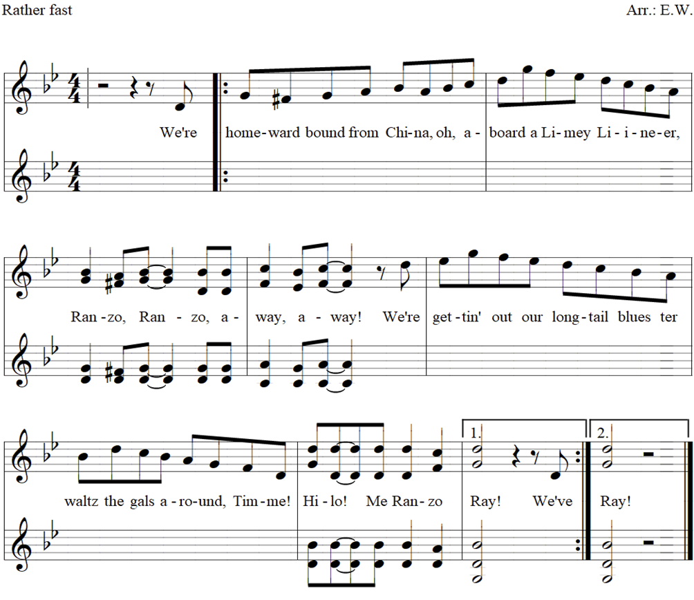 We’re homeward bound from China, Oh, aboard a Limey liner, Ranzo, Ranzo, a-way, a-way! We’re gettin’ out our long-tail blues Ter waltz the gals around. Timmie! Hilo, me Ranzo Ray!