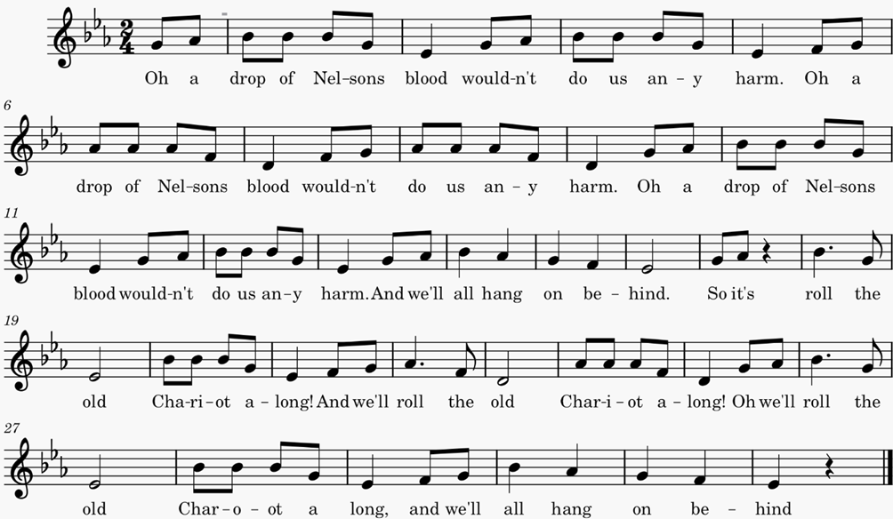 Oh, a drop of Nelson’s blood wouldn’t do us any harm, Oh, a drop of Nelson’s blood wouldn’t do us any harm, Oh, a drop of Nelson’s blood wouldn’t do us any harm. And we’ll all hang on behind! So we’ll Roll the old chariot along! we’ll Roll the old chariot along! we’ll Roll the old chariot along And we’ll all hang on behind!
