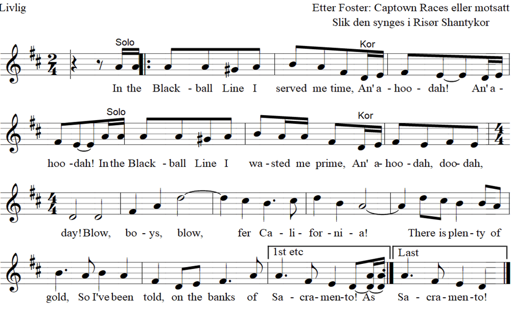 In the Blackball Line I served me time, An’ ahoodah, an’ ahoodah! In the Blackball Line I waisted me prime. An ahoodah, doodah, day! Blow, boys, blow, fer Californ-i-a! There’s plenty o’ gold, so i’ve bin told, On the banks o’ Sacramento!
