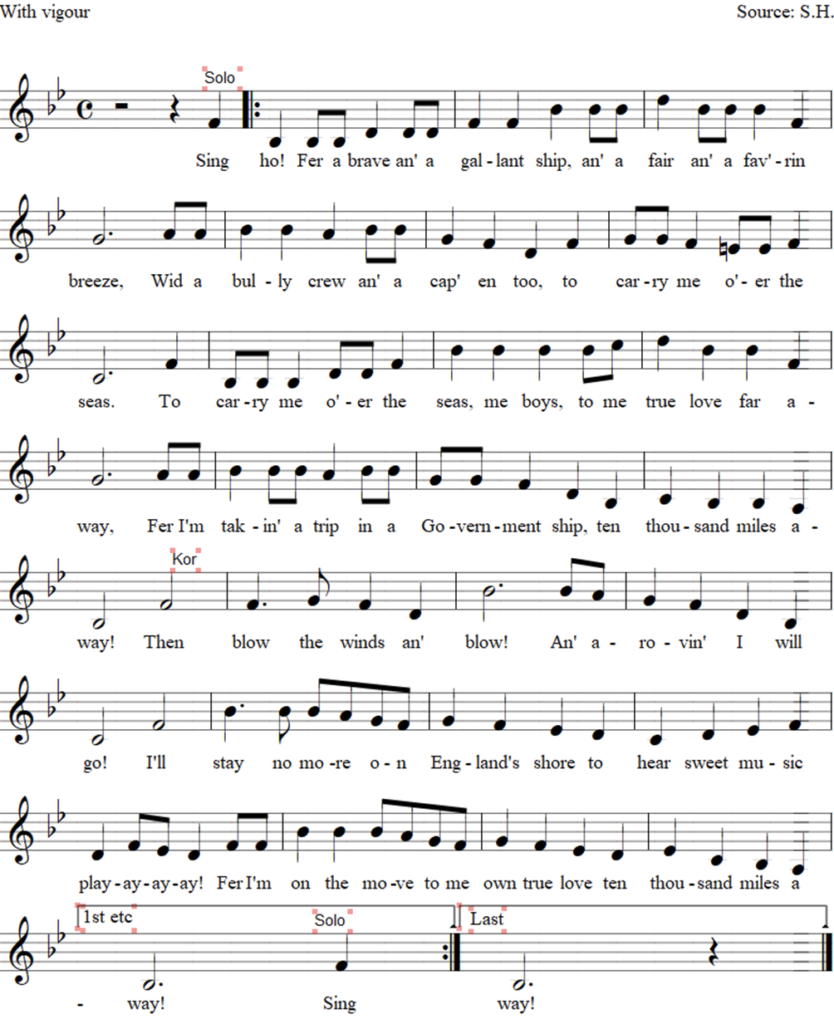 Sing ho! Fer a brave an’ a gallant ship, an’ a fair an’ a fav’rin’ breeze,