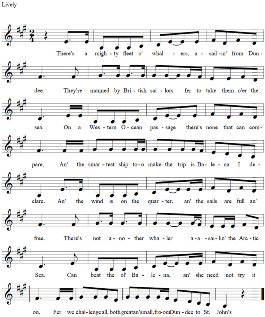 There's a mighty fleet of whalers, a-sailin from Dundee They're manned by British sailors for to take them o'er the sea On a Western Ocean passage there's none that can compare An' the smartest ship to make the trip is Balena, I declare An' the wind is on the quarter, an' the sails are full an' free There's not another whaler a-sailin the Arctic Sea can beat the ol' Balena, an' she need not try it on Fer we challenge all, both great an' small, from Dundee to St. John's!